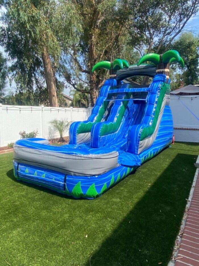 A towering two‑lane slide with an ocean‑wave canopy that arches over the top, creating an epic “wipeout” drop. Its striking blue, green, and gray color scheme screams surf’s‑up excitement. Riders climb a steep ladder, then whoosh down a long run into a deep splash pool rimmed by palm‑tree posts. This one’s built for thrills—and looks spectacular in large open yards or at community events.