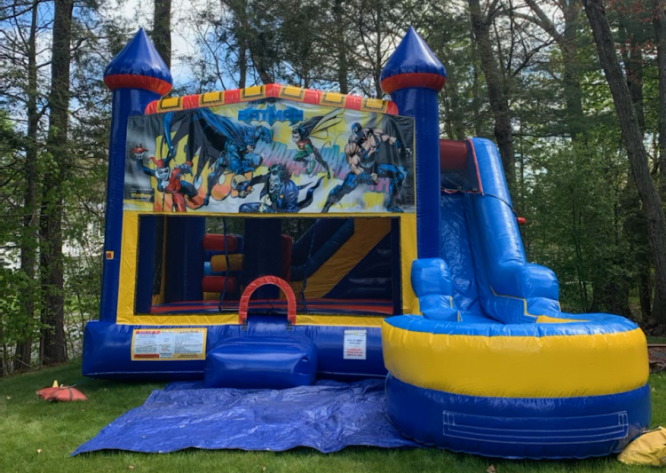 Our Bounce house with slide C7 is great for any event! Without a theme, it allows you to decorate any way you like and it fits right in. Or, choose from our large selection of themed banners to dress it up! Providing a 350+ sq. ft. area allows for plenty of room to bounce, climb, slide, obstacle through and even play basketball. It’s perfect for a day filled with tons of fun!