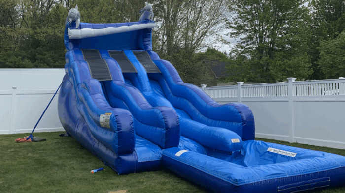 Our 18′ Dolphin Waterslide with Pool will be one of our most popular waterslides this year. Such a fun unit complete with dolphins and a “splash” pool at the bottom. An awesome way to “cool” off on a hot summer day! This inflatable water slide provides nothing but fun and excitement to kids (and adults) of all ages. With its bright and fun colors, it’s a great fit for any event. It’s also so simple to use! We connect the built-in misting system to a standard garden hose and there’s nothing left to do except zip down the slide and into the pool at the bottom. What better way to create super fun memories! (Customer must supply a hose long enough to reach the waterslide).